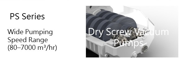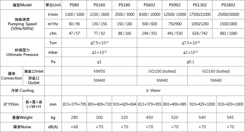 干式螺旋真空泵浦的型號有: PS80、PS160、PS180、PS602、PS902、PS1302、PS1802 PS系列干式螺旋真空泵浦的特色有: